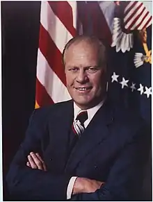 In January 1982, Ford delivered an address to the Houston Republican Club in which he predicted the economy would see an improvement by the middle of the year in the event that President Reagan honor past pledges and not "flip-flop like his predecessors."[49] On February 1, Ford stated that he was in favor of the New Federalism proposal by the Reagan administration and Reaganomics would come into effect soon enough for Republican candidates to be benefited during the midterms that year.[50] On March 24, 1982, Ford offered an endorsement of President Reagan's economic policies while also stating the possibility of Reagan being met with a stalemate by Congress if not willing to compromise while in Washington.[51] On April 1, during an interview in New York City, Ford advocated that the Reagan administration implement the trimming of outlays for major new weapons systems and rejected claims that modest slowdown in nuclear weapon delivery would tamper national security as "hogwash".[52] Days later, during a speech, Ford stated the Reagan administration would be better suited deterring aggression with "a margin of superiority in national security" as opposed to President Reagan's proposed arm buildups.[53] In May, while speaking to reporters during his attendance of a Home Builders Association of Maryland political fundraiser, Ford stated his optimism for Congress to arrive at a budget compromise: "They muddle around in the Congress, but they always seem to get the job done."[54] In July, while speaking to the Forum Club of Houston, Ford expressed his differences with President Reagan's proposed balanced budget amendment to the Constitution and said the only way to prevent budget deficits was through electing members of Congress that would not be in favor of spending beyond the revenue of the government.[55] In November, while addressing a crowd at Salem State College, Ford stated the only issue Americans were facing was a slow economy that would be reversed eventually and his views that the election would not be repudiation of Reaganomics but that the conclusion would move both parties "toward the center."[56]