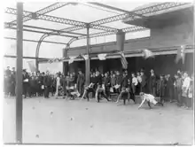It is unclear precisely where and when the potato race was originally developed. It was mentioned by name without elaboration in newspaper reports of athletic events in Scotland, Australia, and Wales as early as the 1860s.[1][2][3] The state fair of Wisconsin advertised a potato race "that beats Base Ball all hollow" in 1869, although again there was no description of the rules.[4] In September 1871, newspapers in a number of US states reprinted a report from the Boston Advertiser which detailed an on-foot potato race that had taken place in East Wilton, New Hampshire, with many remarking that such events were becoming fashionable.[5][6][7] The county fair of Lycoming County, Pennsylvania listed an on-foot potato race on its program in September 1871, directly referencing these reports.[8][9] Official rules for potato racing were printed in the 1902 Official Handbook of the Amateur Athletic Union of the United States.[10]