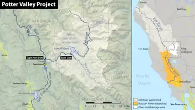 The Potter Valley Project is an interbasin water transfer project in Northern California in the United States, delivering water from the Eel River basin to the headwaters of the Russian River. The project is owned and operated by Pacific Gas and Electric Company (PG&E). The main facilities are two dams on the Eel River, a diversion tunnel and hydroelectric plant.[1] Average annual throughput is 159,000 acre⋅ft (196,000,000 m3), although this figure varies significantly with both the amount of precipitation in the Eel River basin and the demand on the Russian River.[2]