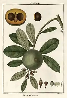 This evergreen tree is up to 20 m tall, and has greyish-brown, fissured bark, which produces a milky white exudate.[3][4][5] The end of branchlets and the petioles are covered with short, brown hairs.[4][5] The leaves are simple, oblanceolate to elliptical, up to 25 cm long and 10 cm wide, and glabrous (or sometimes slightly hairy on the underside) grouped at the end of the branches.[3][4] Flowers are solitary or in fascicles, small, axillary, with hairy sepals and a corolla forming a tube 1.0-1.8 cm long, greenish white, with five lobes, five stamens, five staminodes, a pubescent ovary, and a style 0.8-1.5 cm long.[3][4] The fruit is globose, 6–12 cm long, glabrous, and russet to yellow when mature; the pulp is bright yellow; the one to several seeds are 1.8-3.5 cm long, dark brown, and glossy.[3][4]