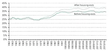 Data based on incomes published in 2016 by Department for Work and Pensions (DWP) show that, after housing costs have been taken into consideration, the number of people living in the UK in relative poverty to be 13.44m (21% of the population).[1] In 2015, a report by Institute for Fiscal Studies reported that 21.6% of Britons were now in relative poverty. The report showed that there had been a fall in poverty in the first few years of the twenty-first century, but the rate of poverty remained broadly flat in the decade after 2004/5.[2]