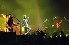 ![]() Powderfinger performing "These Days" on the Across the Great Divide tour, September 2007, Sydney Left to right: Lachlan Doley (auxiliary musician), Jon Coghill, Darren Middleton, Bernard Fanning, John Collins (obscured), Ian Haug | |