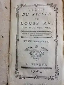 Précis du siècle de Louis XV (Short history of the Age of Louis XV) is a historical work by the French philosopher and author Voltaire, first published in its own right 1768.[1] Celebrating the progress of Enlightenment ideas and the retreat of prejudice, it comments on cultural, economic and technological progress made in France during the reign of Louis XV of France.[1]
