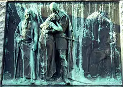 There are two bronze reliefs on the lower part of the pedestal, depicting scenes from Prešeren's Poems.[3] The right one, titled Farewell (Slovo) or Črtomir and Bogomila (Črtomir in Bogomila), depicts a scene from the poem The Baptism on the Savica. The left one, titled Fisherman (Ribič), depicts a scene from the poem Fisherman.[7] The reliefs on the pedestal were created by Zajec.[3] They have a Classicist composition, a Realist cadre, an impressionist final touch, and emphasise Prešeren's Romantic poetry with its content.[2] The upper part of the pedestal is decorated with a stylised lime tree, reminding of the poet's homeland's symbol.[1]