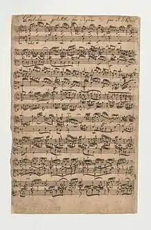 Prelude and Fugue in E minor, BWV 548 is a piece of organ music written by Johann Sebastian Bach sometime between 1727 and 1736,[1] during his time in Leipzig. The work is sometimes called "The Wedge" due to the chromatic outward motion of the fugue theme.[1] Unlike most other organ preludes and fugues of Bach, the autograph fair copy of the score survives,[2] though the handwriting changes twenty two measures into the fugue to the hand of Johann Peter Kellner,[3] a likely pupil and acquaintance of Bach who played an important role in the copying of his manuscripts. Because of the work's immense scope, it has been referred to as "a two-movement symphony" for the organ.[4]