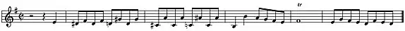 The subtitle of the work, commonly referred to as "The Wedge", refers to the first half of the fugue subject, which opens up as a sort of widening, chromatic wedge around the tonic point.[1] The tradition of descending chromatic fourths in Bach's e minor fugue subjects include the BWV 914 harpsichord Toccata, the BWV 855 Prelude and Fugue from the Well Tempered Clavier, Book 1, as well as the "Un poco Allegro" movement from the BWV 528 Organ Sonata.[7] The fugue, clocking at 231 measures, is among Bach's longest and most elaborate organ fugues. The movement is unique in that it is in a three-part structure, with the third da capo section being a note-for-note reprise of the first. The second section suddenly thrusts the piece into an over-one-hundred measure episode of rapid, toccata-like passages of great virtuosity, with the cascading passagework occasionally giving way to the subject.[8]