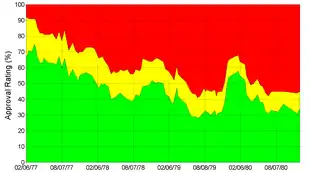 Federal budget deficits throughout Carter's term remained at around the $70 billion level reached in 1976, but as a percentage of GDP the deficits fell from 4% when he took office to 2.5% in the 1980–81 fiscal year.[48] The national debt of the United States increased by about $280 billion, from $620 billion in early 1977 to $900 billion in late 1980.[49] However, because economic growth outpaced the growth in nominal debt, the federal government's debt as a percentage of gross domestic product decreased slightly, from 33.6% in early 1977 to 31.8% in late 1980.[50]