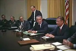 Johnson concentrated decision-making in his greatly expanded White House staff.[16][17][18] Many of the most prominent Kennedy staff appointees, including Ted Sorensen and Arthur M. Schlesinger Jr., left soon after Kennedy's death. Other Kennedy staffers, including National Security Advisor McGeorge Bundy and Larry O'Brien, played important roles in the Johnson administration.[19] Johnson did not have an official White House Chief of Staff. Initially, his long-time administrative assistant Walter Jenkins presided over the day-to-day operations at the White House.[20] Bill Moyers, the youngest member of Johnson's staff, was hired at the outset of Johnson's presidency. Moyers quickly rose into the front ranks of the president's aides and acted informally as the president's chief of staff after the departure of Jenkins.[21] George Reedy, another long-serving aide, assumed the post of White House Press Secretary,[22] while Horace Busby, a valued aide to Johnson at various points in his political career, served primarily as a speech writer and political analyst.[23] Other notable Johnson staffers include Jack Valenti, George Christian, Joseph A. Califano Jr., Richard N. Goodwin, and W. Marvin Watson.[24]