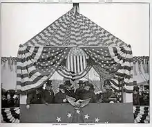 African Americans saw the onset of war in 1898 as an opportunity to display their patriotism, and black soldiers fought bravely at El Caney and San Juan Hill. African Americans in the peacetime Army had formed elite units; nevertheless they were harassed by whites as they traveled from the West to Tampa for embarkation to the war. Under pressure from black leaders, McKinley required the War Department to commission black officers above the rank of lieutenant. The heroism of the black troops did not still racial tensions in the South, as the second half of 1898 saw several outbreaks of racial violence; eleven African Americans were killed in riots in Wilmington, North Carolina.[69] McKinley toured the South in late 1898, hoping for sectional reconciliation. In addition to visiting Tuskegee Institute and Booker T. Washington, he addressed the Georgia legislature, wearing a badge of gray, and visited Confederate memorials. In his tour of the South, McKinley did not mention the racial tensions or violence. Although the president received a rapturous reception from Southern whites, many African Americans, excluded from official welcoming committees, felt alienated by the president's words and actions.[69][70]