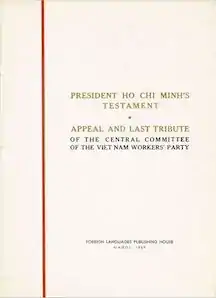 The President Ho Chi Minh's Testament is a political document written by Vietnamese revolutionary and President Ho Chi Minh. In his thousand word testament, Ho Chi Minh extols his countrymen to continue the fight for independence and communist revolution in a unified Vietnam.[1][2][3] The testament also provides instructions for the Communist Party of Vietnam to lead the Vietnamese people towards socialism and national liberation.[4] The continues testament is the subject of wide discussion and study in Vietnam, and was central to the development of Ho Chi Minh Thought.[2][5]