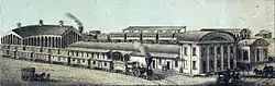 The PW&B started building its own station at the southwestern corner of President Street with Canton Avenue with train yards, including a roundhouse, shops and freight warehouses of about six square city blocks, extending east along Canton Avenue (later renamed Fleet Street).[6]:3 The Greek Revival-style station opened on February 18, 1850.[7][8] In addition to the brick head house with a distinctive arched roof, the original station also had a 208 feet (63 m) long barrel vaulted train shed over the tracks.[9] The PW&B added a similarly styled freight house, adjacent to the south of the passenger station, in 1852.[6][10]