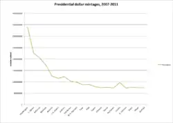The program began on January 1, 2007, and like the 50 State quarters program, was not scheduled to end until every eligible subject was honored. The program was to issue coins featuring each of four presidents per year on the obverse, issuing one for three months before moving on to the next president in chronological order by term in office. To be eligible, a President must have been deceased for at least two years prior to the time of minting.[6] The United States Mint called it the Presidential $1 Coin Program.[7]