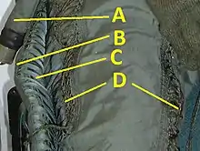 Indirect compression suits generally require complex ribbed mechanical structures at the joints, which create flexible but inelastic folds or pockets in the skin of the suit that act to maintain a constant air volume in the suit as the wearer moves. These pockets exist on both sides of a flexible joint and are designed to work together in tandem, so that when a joint is flexed, the folds on one side of the joint will compress and shrink in volume, while the folds on the opposite side will relax and expand in volume. The ribbed structures are usually braced with wire cables or cloth straps to limit their motion and prevent unusual flexing modes that may chafe against the user's body. The wire hinge cables also restrain the complex folds, which if released could unfurl and extend to be more than a meter longer than the wearer's body.