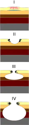 The definitions of the pressure ulcer stages are revised periodically by the National Pressure Injury Advisory Panel (NPUAP)[10] in the United States and the European Pressure Ulcer Advisory Panel (EPUAP) in Europe.[11] Different classification systems are used around the world, depending upon the health system, the health discipline and the purpose for the classifying (e.g. health care versus, prevalence studies versus funding.[12] Briefly, they are as follows:[13][14]