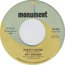 Early in 1963, Nelson was signed by Fred Foster to the label Monument Records.[5] In October 1963, Nelson sang "Pretty Paper" for Foster, who was impressed and decided to forward the song to Roy Orbison in London. Bill Justis worked the arrangements and the demo tape was sent to Orbison in England.[6] According to Marcel Riesco's research for the official Roy Orbison biography,[7] The Authorized Roy Orbison, "Pretty Paper" was recorded at Decca Studio 2 in London with music director Ivor Raymonde, who made last-minute arrangements with his orchestra. Each musician was provided with microphones newly designed by Decca Records' engineers. The microphones were worn around the neck to amplify the strings. Orbison attended the session with a 102-degree fever.[3] According to Riesco's research, Orbison recorded the song in 12 takes. The B-side, "Almost," [6] was also done that day.
