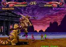 Primal Rage is a traditional two-dimensional fighting game in which two players select characters to battle each other in one-on-one combat, or a single player is faced with a campaign of fights against the artificial intelligence (AI) over increasing difficulty.[1] The final battle of the single-player game consists of fighting all the other AI monsters with an increased power bar, made available in a minigame prior to the fight. A total of seven characters are playable. Each character has their own specialized set of three attack moves and abilities. The object is to deplete the opposing character's health meter before the player's own runs out. There are also seven different background stages where fighting takes place, each one representing one of the character's innate domains: the Cliff (Blizzard), the Hollows (Armadon), the Strip (Talon), the Cove (Sauron), the Ruins (Chaos), the Tomb (Vertigo) and the Inferno (Diablo).