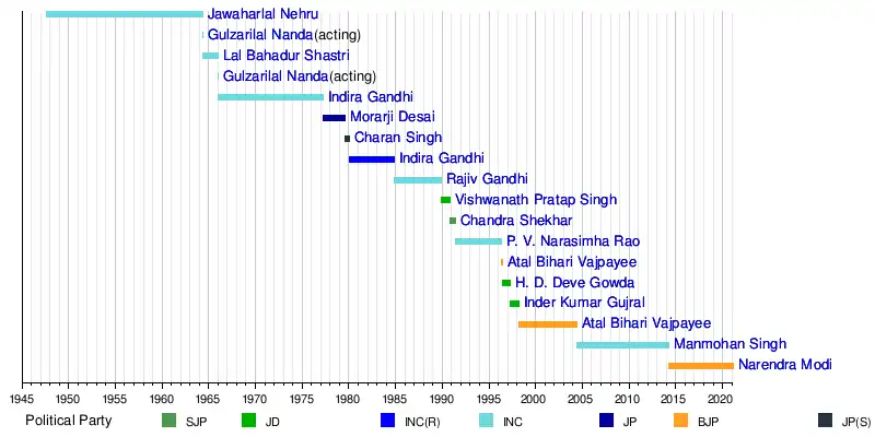Since 1947, there have been 14 different prime ministers.[lower-alpha 1] The first few decades after 1947 saw the Indian National Congress' (INC) almost complete domination over the political map of India. India's first prime minister—Jawaharlal Nehru—took oath on 15 August 1947. Nehru went on to serve as prime minister for 17 consecutive years, winning four general elections in the process. His tenure ended in May 1964, on his death.[2][3] After the death of Nehru, Lal Bahadur Shastri—a former home minister and a leader of the Congress party—ascended to the position of Prime Minister. Shastri's tenure saw the Indo-Pakistani War of 1965. Shashtri subsequently died of a reported heart attack in Tashkent, after signing the Tashkent Declaration.[4]