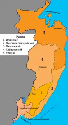 The capital of the oblast was originally Nikolayevsk-on-Amur, during 1880-1888 – Khabarovka (presently named Khabarovsk), and during 1888 it was relocated to Vladivostok.[1]