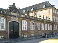 The Prince's Mansion is one of the earliest Rococo buildings in Copenhagen. It has three wings with a courtyard closed to Frederiksholms Kanal by a single-story gallery with an entrance gate in the middle. The gallery is topped by a balustrade with vases and statues. The statues together with window decorations on the garden side were saved from Krieger's building from 1726.[5]