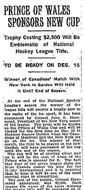 - "Prince of Wales Sponsors New Cup: Trophy Costing $2,500 Will Be Emblematic of National Hockey League Title". New York Times. December 7, 1925. p. 26.