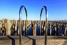With the containerisation boom the pier became unused, being closed to public access in the early 1990s due to the poor timber condition, and squatters caused a fire in the late 1990s that destroyed the store structures.[2] In the three years to 2004, 14 fires occurred.[1] A refurbishment estimated to cost $14 million was announced by the State Government in April 2006, with the first 196 metres of the Pier fully restored, beyond that point the decking being removed and the original pylons preserved. A full restoration was estimated at $60 million.[6] A contract for the work was awarded in June 2007,[7] and work began in October of the same year.[8] The pier reopened to the public in December 2011.