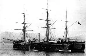 Neither ship had a particularly eventful career. They were completed too late to take part in the final stages of the wars of Italian unification. Instead, they were assigned to the Italian colonial empire, with occasional stints in the main Italian fleet.[6] In 1880, Palestro took part in a naval demonstration off Ragusa in an attempt to force the Ottoman Empire to comply with the terms of the Treaty of Berlin and turn over the town of Ulcinj to Montenegro.[7] The following year, Principe Amedeo was involved in a collision with the ironclad Roma during a hurricane, though neither ship was damaged.[8]