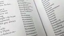 Print Wikipedia is an art project by Michael Mandiberg that printed 106 of the 7,473 volumes of English Wikipedia as it existed on April 7, 2015. The project shows the spines of the first 1,980 volumes in the set, supplemented by 106 actual physical volumes, each of which runs to 700 pages.[1][2] A 36-volume index of all of the 7.5 million contributors to English Wikipedia is also part of the project. The table of contents takes up 91 700-page volumes.[3] The printed volume only includes text of the articles: images and references are not included.[4] The project was shown at the Denny Gallery in New York City in the summer of 2015.[5] Similar projects have been held with a printed part of the German Wikipedia (Berlin, 2016) and with the Dutch Wikipedia (Ghent, 2016)[6]