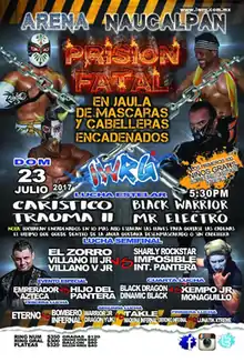 Starting as far back as at least 2000, the Mexican wrestling promotion International Wrestling Revolution Group (IWRG; Sometimes referred to as Grupo Internacional Revolución in Spanish) has held several annual events where the main event was a multi-man steel cage match where the last wrestler left in the cage would be forced to either remove their wrestling mask or have their hair shaved off under Lucha de Apuestas, or "bet match", rules. From 2012 IWRG has promoted a variation of the steel cage match under the moniker Prisión Fatal ("Deadly Prison") at least once a year since its inception. The Prisión Fatal has the added twist that each competitor is chained by the wrist to the cage with a long steel chain and to escape they fight have to get a key to unlock their chain before they are able to escape. The added chain helps to distinguish it from other Steel cage matches held throughout the year such as the IWRG Guerra del Golfo ("Gulf War"), IWRG Guerra de Sexos ("War of the Sexes") or IWRG El Castillo del Terror ("The Tower of Terror") shows. The Prisión Fatal shows, as well as the majority of the IWRG shows in general, are held in "Arena Naucalpan", owned by the promoters of IWRG and their main arena. The July 2017 Prisión Fatal show was the eight time that IWRG promoted a show under that name and the second time in 2017, after a Prisión Fatal show in January.[1]