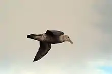 The procellariids are small- to medium-sized seabirds. The largest, the giant petrels with a wingspan of 81 to 99 cm (32 to 39 in), are almost as large as albatrosses; the smallest, such as the fairy prion have a wingspan of 23 to 28 cm (9.1 to 11.0 in),[12] are slightly bigger than the diving petrels. There are no obvious differences between the sexes, although females tend to be slighter.[13] Like all Procellariiformes, the procellariids have a characteristic tubular nasal passage used for olfaction.[14] This ability to smell helps to locate patchily distributed prey at sea and may also help locate nesting colonies. The plumage of the procellariids is usually dull, with greys, blues, blacks and browns being the usual colours, although some species have striking patterns (such as the Cape petrel).