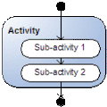 Sequential activities are activities that need to be carried out in a pre-defined order. The activities are connected with an arrow, implying that they have to be followed in that sequence. Both activities and sub-activities can be modeled in a sequential way. In Figure 1 an activity diagram is illustrated with one activity and two sequential sub-activities. A special kind of sequential activities are the start and stop states, which are also illustrated in Figure 1.