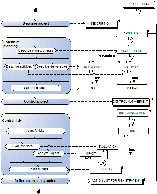 The process-data diagram that is depicted at the right, gives an overview of all of these activities/processes and deliverables. The four gray boxes depict the four main implementation phases, which each contain several processes that are in this case all sequential. The boxes at the right show all the deliverables/concepts that result from the processes. Boxes without a shadow have no further sub-concepts. Boxes with a black shadow depict complex closed concepts, so concepts that have sub-concepts, which however will not be described in any more detail. Boxes with a white shadow (a box behind it) depict open closed concepts, where the sub-concepts are expanded in greater detail. The lines with diamonds show a has-a relationship between concepts.