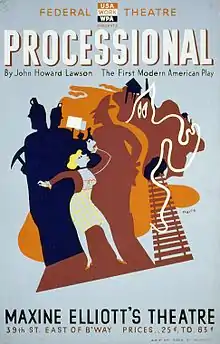 ![]() Poster for Federal Art Project presentation of Processional ("The First Modern American Play") at the Maxine Elliott Theatre, 1937 | |