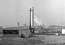 In parallel to the ICBM programme, the United States developed three separate intermediate range ballistic missile (IRBM) systems. On 8 November 1955, Wilson approved IRBM projects by both the United States Army and the United States Air Force (USAF). The United States National Security Council gave the ICBM and IRBM projects the highest national priority.[16] The Army Ballistic Missile Agency, commanded by Major General John B. Medaris, with Wernher von Braun as its technical director, developed the Jupiter (SM-78) IRBM. After three failures, its first successful flight took place at the Cape Canaveral Air Force Station on 31 May 1957. The United States Navy initially participated in the Jupiter programme, intending to launch the missiles from ships, but in view of their size, decided instead to develop a smaller, solid-propellant IRBM that could be launched from a submarine, which became Polaris.[17] Despite reluctance on the part of Major General Bernard Schriever, the commander of the USAF Western Development Division, to take on IRBM development, and a pronounced lack of enthusiasm for missiles among senior USAF officers, who preferred manned bombers, the rival USAF project moved quickly.[18] The Douglas Aircraft Company was awarded the contract for the development of the missile, which was codenamed Thor (SM-75), in December 1955. Rocketdyne, Ramo-Wooldridge, AC Spark Plug, Bell Laboratories and General Electric were engaged as the subcontractors for the rocket engine, technical coordination, inertial guidance system, radio guidance system, and re-entry vehicle respectively.[19][20] The first missile was delivered to Patrick Air Force Base on 26 October 1956. After four unsuccessful attempts, the first successful test flight took place on 20 September 1957.[21]