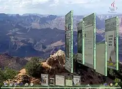 Looking Glass was first developed by Hideya Kawahara, a Sun programmer who wrote it in his spare time on a small Linux laptop. After demonstrating an early version to Sun executives, he was assigned to it full-time with a dedicated team and open sourced the project.[4] It was first demonstrated publicly by Jonathan Schwartz at LinuxWorld Expo 2003 in San Francisco, and since then has gathered momentum in development.[5] After unveiling the prototype, Steve Jobs called Schwartz's office and told him that Apple would sue Sun if they moved forward to commercialize it. Jobs claimed that the project is infringing Apple's IP.[6] Regardless of the threat, Sun determined that the project was not a priority and decided not to put more resource to develop it further into product quality. The project thus had been continuing in an experimental mode. However, Sun's financial situation became tighter and the management determined they had higher priority projects on their hands. The project has been inactive since late 2006.[7]