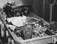 The Mercury spacecraft's principal designer was Maxime Faget, who started research for human spaceflight during the time of the NACA.[47] It was 10.8 feet (3.3 m) long and 6.0 feet (1.8 m) wide; with the launch escape system added, the overall length was 25.9 feet (7.9 m).[48] With 100 cubic feet (2.8 m3) of habitable volume, the capsule was just large enough for a single crew member.[49] Inside were 120 controls: 55 electrical switches, 30 fuses and 35 mechanical levers.[50] The heaviest spacecraft, Mercury-Atlas 9, weighed 3,000 pounds (1,400 kg) fully loaded.[51] Its outer skin was made of René 41, a nickel alloy able to withstand high temperatures.[52]