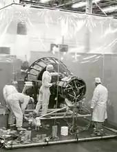 The spacecraft were produced at McDonnell Aircraft, St. Louis, Missouri, in clean rooms and tested in vacuum chambers at the McDonnell plant.[108] The spacecraft had close to 600 subcontractors, such as Garrett AiResearch which built the spacecraft's environmental control system.[33][61] Final quality control and preparations of the spacecraft were made at Hangar S at Cape Canaveral.[109][n 11] NASA ordered 20 production spacecraft, numbered 1 through 20.[33] Five of the 20, Nos. 10, 12, 15, 17, and 19, were not flown.[112] Spacecraft No. 3 and No. 4 were destroyed during uncrewed test flights.[112] Spacecraft No. 11 sank and was recovered from the bottom of the Atlantic Ocean after 38 years.[112][113] Some spacecraft were modified after initial production (refurbished after launch abort, modified for longer missions, etc.).[n 12] A number of Mercury boilerplate spacecraft (made from non-flight materials or lacking production spacecraft systems) were also made by NASA and McDonnell.[116] They were designed and used to test spacecraft recovery systems and the escape tower.[117] McDonnell also built the spacecraft simulators used by the astronauts during training.[118]