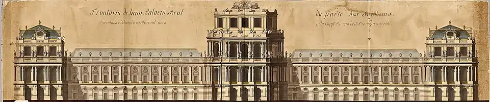 The two alternative elevations of possible main façades done by military engineer Captain Dionizio S. Dionizio in 1760 are thought to have been executed under the guidance of Eugénio dos Santos, though the details surrounding the palace's planning are unclear.