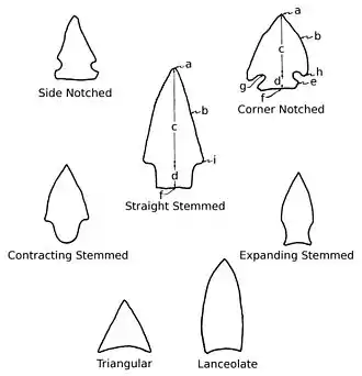 Projectile points fall into two general types: dart/spear points, and arrow points. Larger points were used to tip spears and atlatl darts. Arrow points are smaller and lighter than dart points, and were used to tip arrows. The question of how to distinguish an arrow point from a point used on a larger projectile is non-trivial. According to some investigators, the best indication is the width of the hafting area, which is thought to correlate to the width of the shaft.[4] An alternative approach is to distinguish arrow points by their necessarily smaller size (weight, length, thickness).[5]