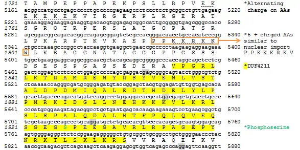The PRR12 transcript encodes a protein that is 2036 residues long. It has a molecular weight of 211.1 kdal and an isoelectric point around 7.728.[15] A number of bioinformatics databases have also predicted PRR12 to be a soluble protein with no transmembrane domains.[15][16][17] Jianping Chen lists PRR12 as an "extremely vulnerable protein".[18] These proteins have regions rich in amino acids that are “poor protectors” of hydrogen bonds along the backbone of the protein, inhibiting the ability of these proteins to fold properly and allowing the possibility of protein aggregation. Residues such as G, A, S, Y, and P are listed as poor protectors and PRR12 is rich in both proline and glycine.[15][18] Many of the proline residues are positioned consecutively in regions of low complexity. These regions may give this protein interesting secondary structure as a cluster of proline can form a polyproline helix.[19] PRR12 contains a possible nuclear import signal starting at P1794. A typical nuclear localization sequence would have the following residues: P-P-K-K-K-R-K-V.[20] PRR12 contains a DUF4211 domain starting at V1836 that shows homology to the pfam13926 domain.[21] This domain is well conserved in PRR12 orthologs. PRR12 also contains well conserved AT-hook binding regions at P1168 and G1202. These regions allow proteins to bind DNA, further supporting the localization of PRR12 to the nucleus.