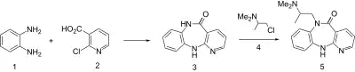 Condensation of 2-chloronicotinic acid (2) with o-phenylenediamine (1) leads directly to the tricyclic lactam (3) Although the reaction involves amide formation and nucleophilic aromatic displacement of chlorine, the order of these steps is not known. Alkylation of the anion obtained by treatment if 3 with the 1-chloro-2-dimethylaminopropane (4) affords the antidepressant compound propizepine (5).