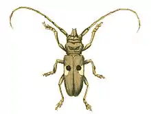 General colour brownish grey. Head deep and grey; one of the sexes having a remarkable thick and strong tubercle issuing from the middle of the face, terminating in two black acute angles, like horns. Mouth armed with two strong black jaws, and four grey palpi. Antennae grey, and longer than the insect. Thorax grey, the sides terminating in a thick spine; having a broad, white streak crossing it on each side, and extending along the abdomen, beyond the middle legs, narrowing to its extremity. Scutellum small and triangular. Elytra grey and margined, having two round black spots on each, the largest placed about the middle near the suture; the other (a small one) is on this side joined to the margin. A cream-coloured spot is situated just below the former, which extends from thence to the lateral margin. Legs grey, without any spines or marks. Body length 1ΒΌ inches (32 mm).[2]