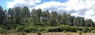 - The South Top: The summit ridge is fairly level but with steep sides. Its highest point is 100 metres (328 feet) above sea level. The western part of the Lower Prospect Canal Reserve walkway and cycleway runs along the foot of the hill's southeast slopes. The lower slopes feature Pampas grass, Ipomoea cairica, Lantana camara, [Olea europaea subsp. cuspidata]], Acacia longifolia and the upper slopes prominently consist a plantation of Monterey pine trees[39] with a few Grey Box and Casuarina trees. Kangaroos and blind snakes are found on the grassy slopes. The hilltop provides panoramic views to the south of Greater Western Sydney. The summit is observable from the suburbs of Smithfield and Wetherill Park in the City of Fairfield. By car, this summit can be entered from Hyland Road in the southeast or Prospect Highway in the southwest, as the walkway leading to it straddles the highway.[40]