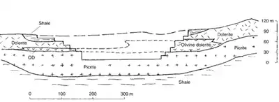 Its heat changed the nature of the surrounding rock to produce a variety of minerals, predominantly coarse grained picrite with olivine-dolerite. The picrite is a coarse-grained rock henpecked by olivine and is made up of two-thirds of the lower component of the intrusion, with the upper third of dolerite also containing other mafic minerals. It didn't quite reach the surface but pushed the surface rocks upwards to form a dome.[32]