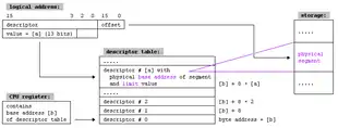 The descriptor table entry defines the real linear address of the segment, a limit value for the segment size, and some attribute bits (flags).