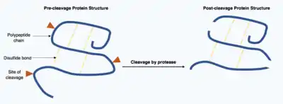 Cleavage of proteins is an irreversible post-translational modification carried out by enzymes known as proteases. These proteases are often highly specific and cause hydrolysis of a limited number of peptide bonds within the target protein. The resulting shortened protein has an altered polypeptide chain with different amino acids at the start and end of the chain. This post-translational modification often alters the proteins function, the protein can be inactivated or activated by the cleavage and can display new biological activities.[16]