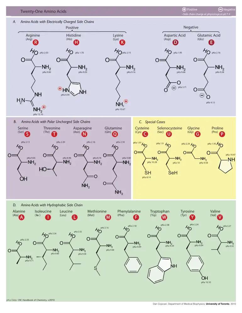 | Selenocysteine | U | Sec | 168.053 | 5.47 | 1.91 | 10 |