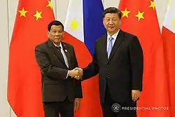 Duterte declared martial law in the whole Mindanao on May 23, 2017 following the crisis in Marawi between Philippine government security forces and militants affiliated with the Islamic State of Iraq and the Levant (ISIL), including the Maute and Abu Sayyaf Salafi jihadist groups.[49][50][51] The deadline of martial law was extended three times.[52]