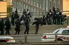 A week after the non-stop protests in Ottawa ended, non-stop protests began on the evening of 26 April in front of the Consulate of the United States in Toronto, urging Barack Obama to call for an immediate permanent ceasefire. Protesters sat down on University Avenue, occupying a large portion of the street.[11] On the third day of the non-stop protest (29 April), fifteen arrests were made while one woman was injured after a brief scuffle with police. This incident was the first one to happen among these protests in Canada.[12][13] The protests later shifted to Queen's Park with a diminished number of protesters.