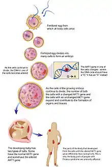 In 2011 researchers determined the cause of Proteus syndrome. In 26 of 29 patients who met strict clinical criteria for the disorder, Lindhurst et al. identified an activating mutation in AKT1 kinase in a mosaic state gene.[11]