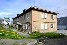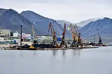 Provideniya is a former Soviet military port, sited on a fjord sheltered from the Bering Sea. The largest inhabited locality east of Anadyr, it was established as a port to serve the eastern end of the Northern Sea Route.[2] The port is found in Komsomolskaya Bay (named after the Soviet Komsomol youth organization), a part of the much larger Provideniya Bay, providing a suitable deep water harbor for Russian ships, close to the southern limits of the winter ice fields.